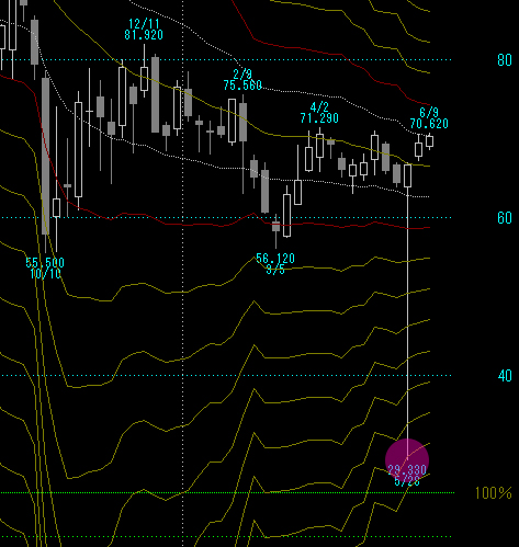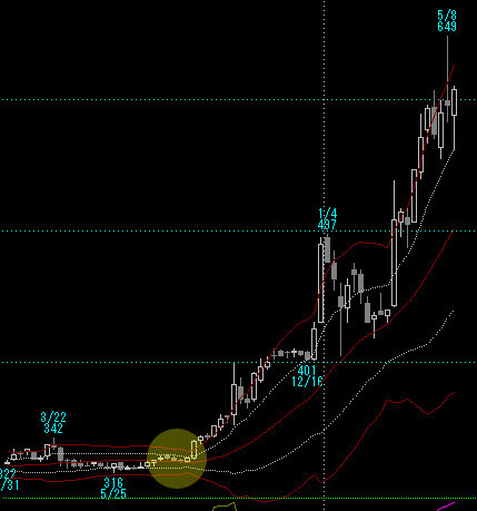 中心となる移動平均線(白)の外側に±1σライン(黄)、±2σライン(青)