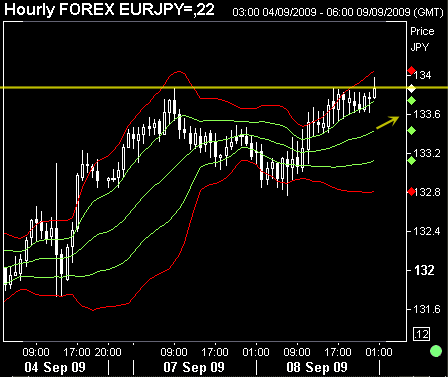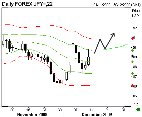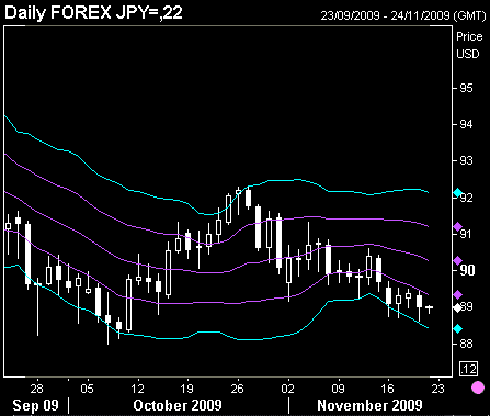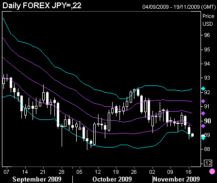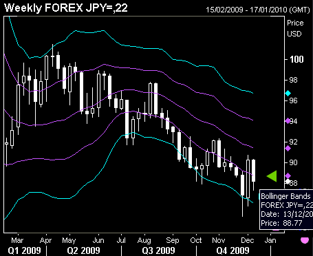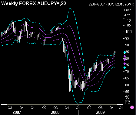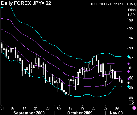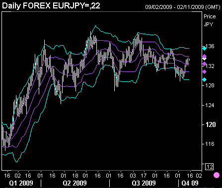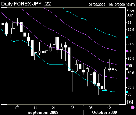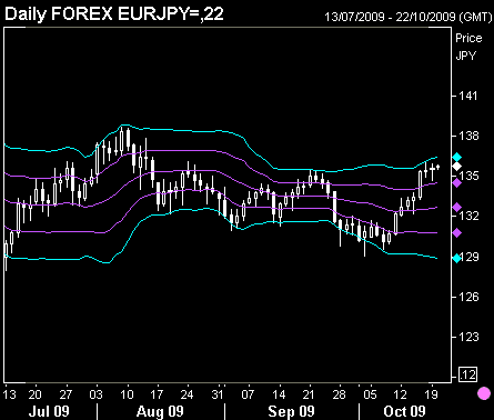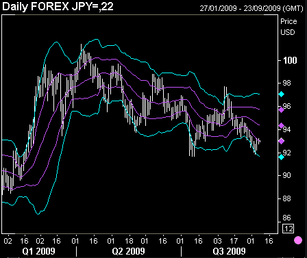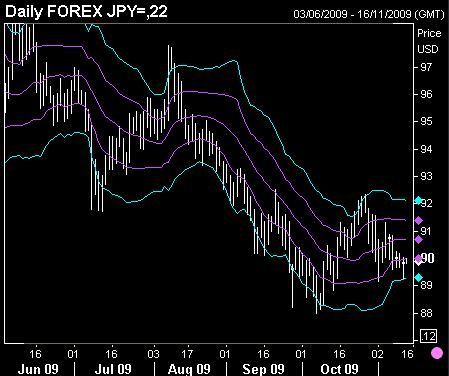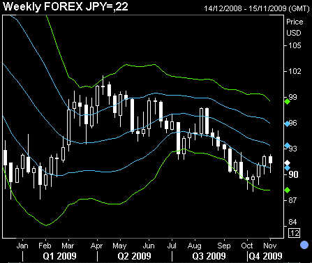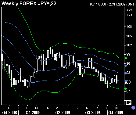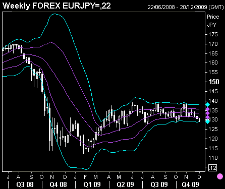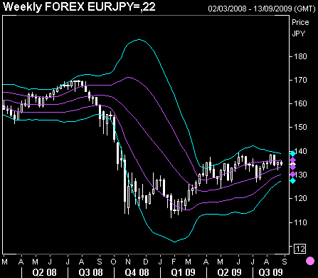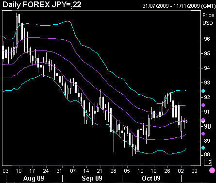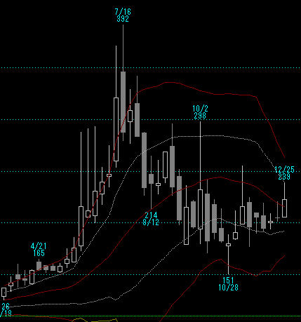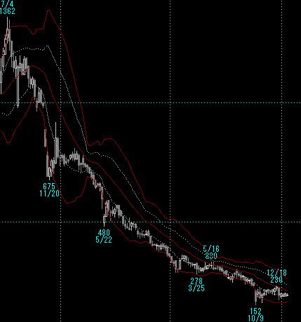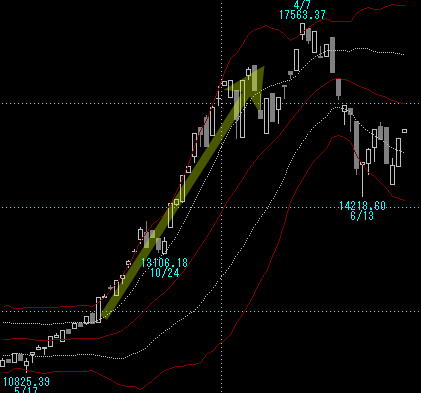 ドル円の週足チャートに21週移動平均線とボリンジャーバンドを描画したチャートです。