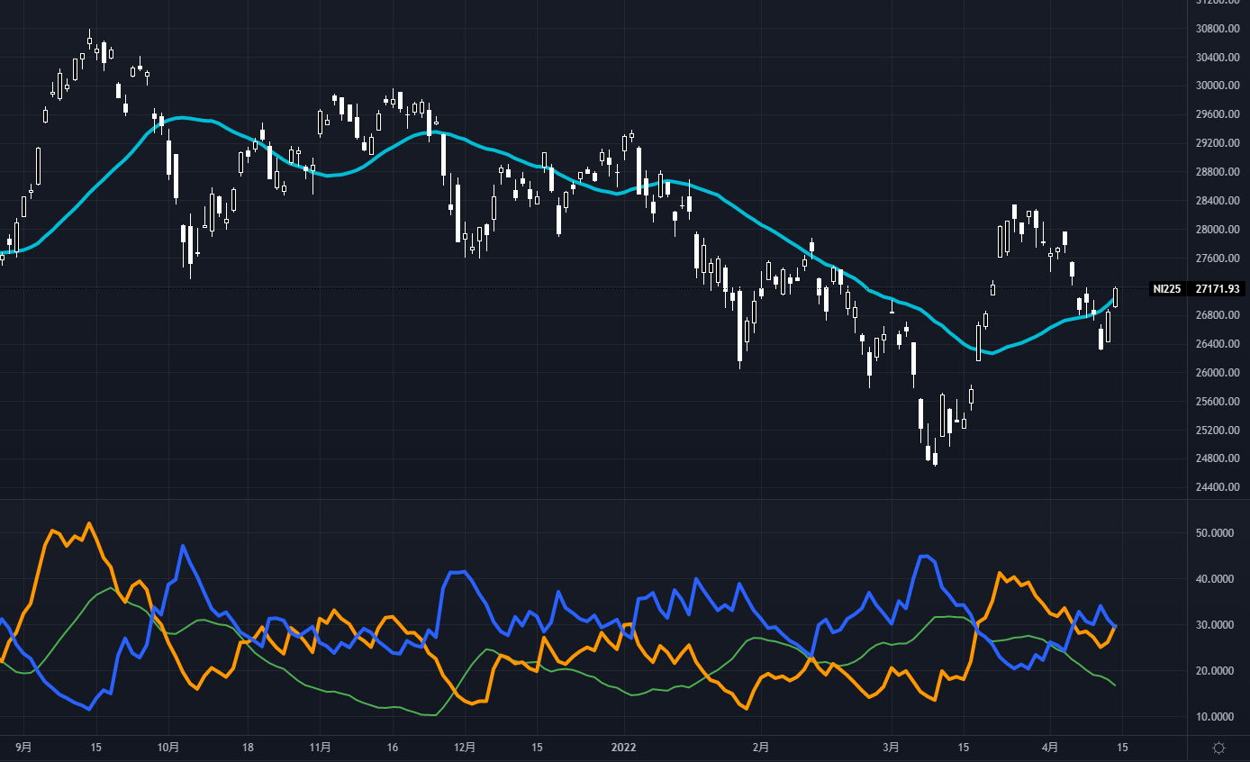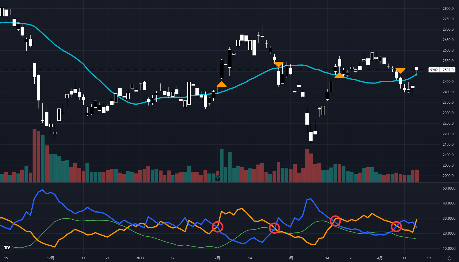 +DI (オレンジ線): 参照期間内の値動きのうちプラス方向の動きの割合