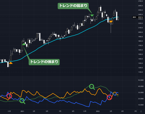 ADX (緑線): +DIと-DIの乖離を示すDXの移動平均