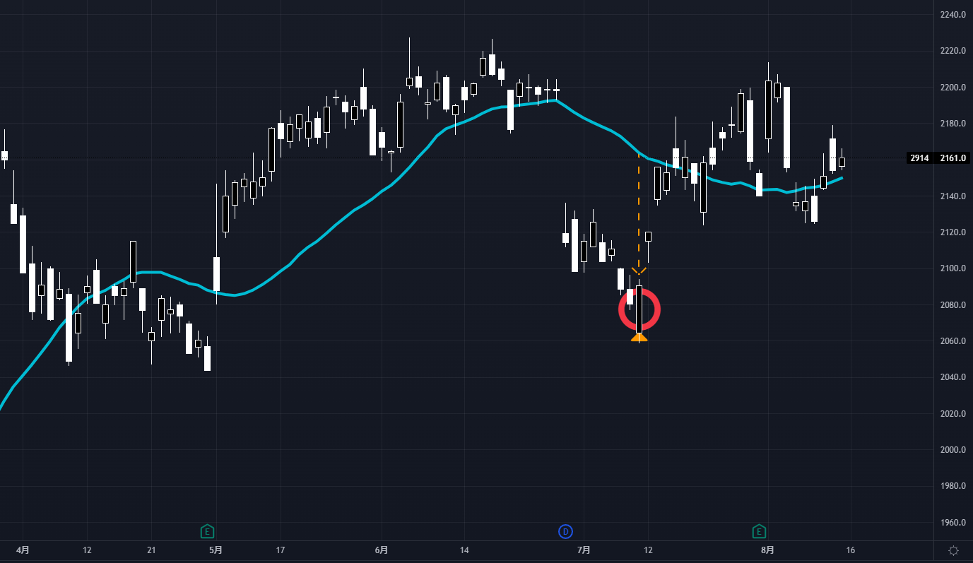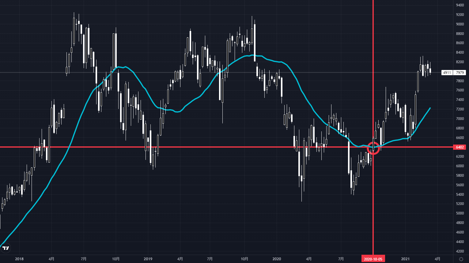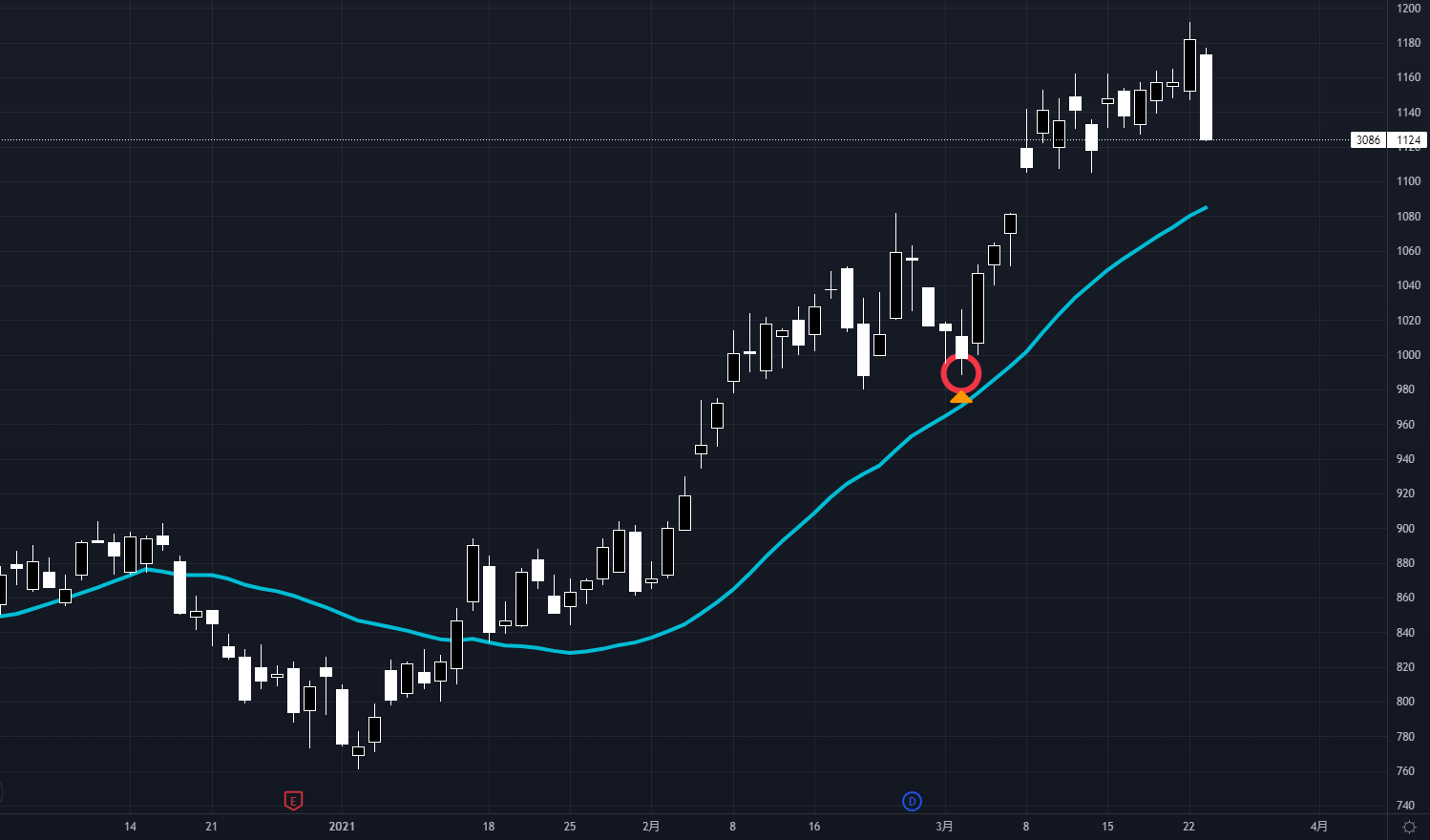 この株価の動きにより、後々、移動平均線が上向くことにつながります。移動平均線の反転をいち早く捉えるトレード手法といえます。