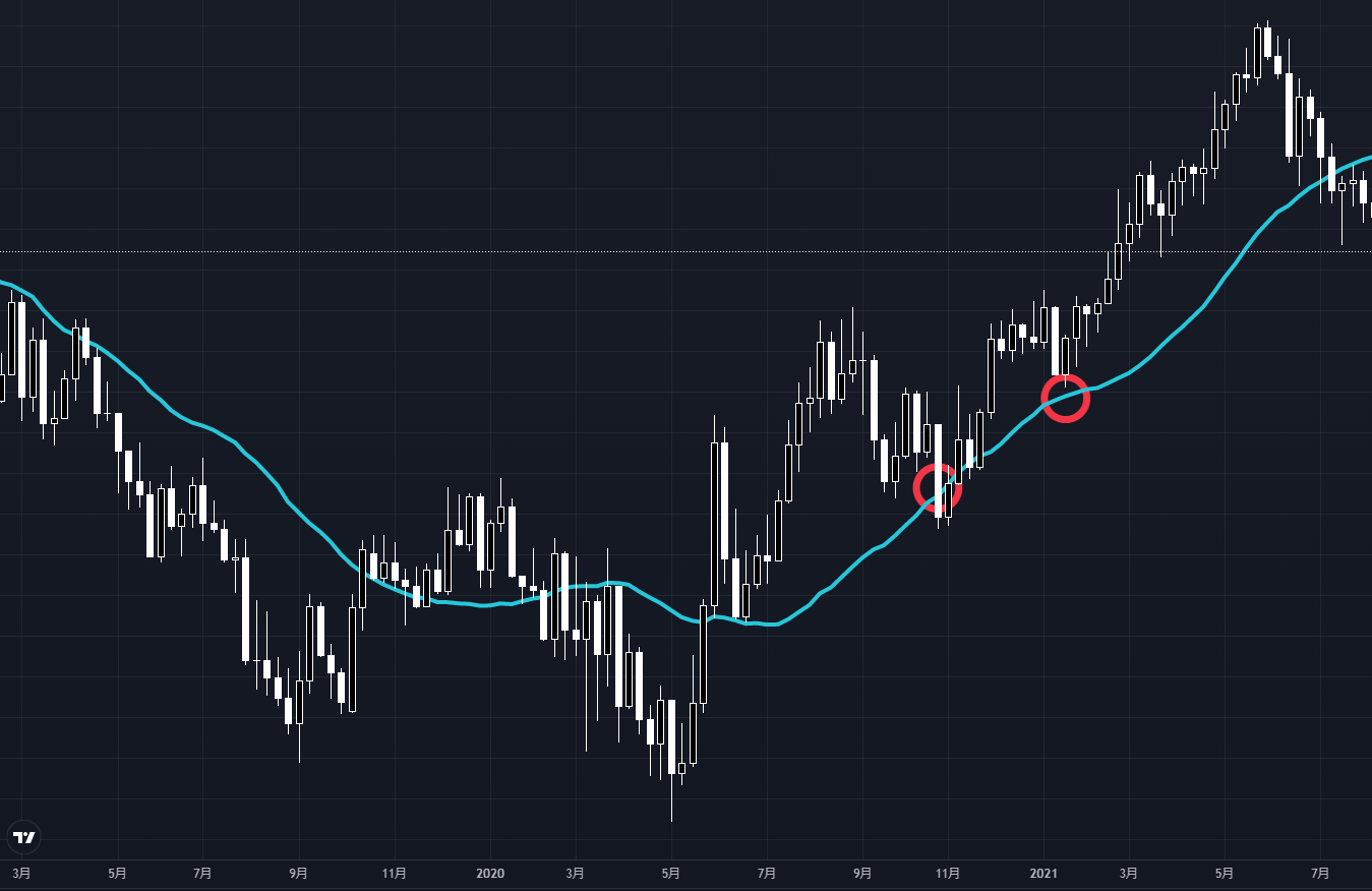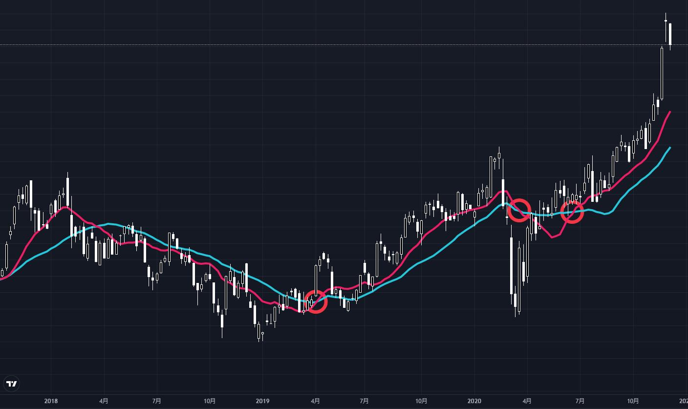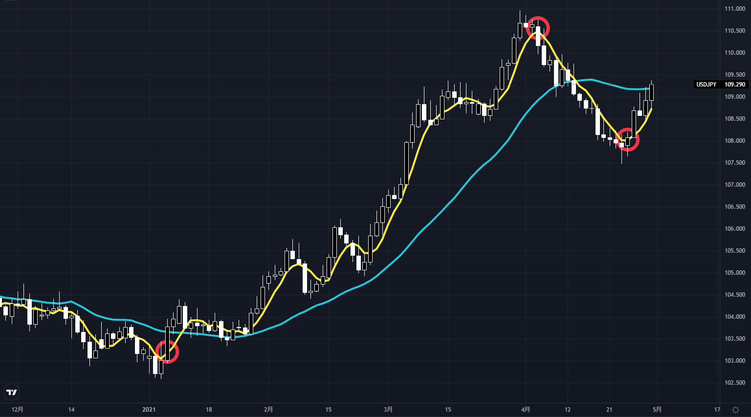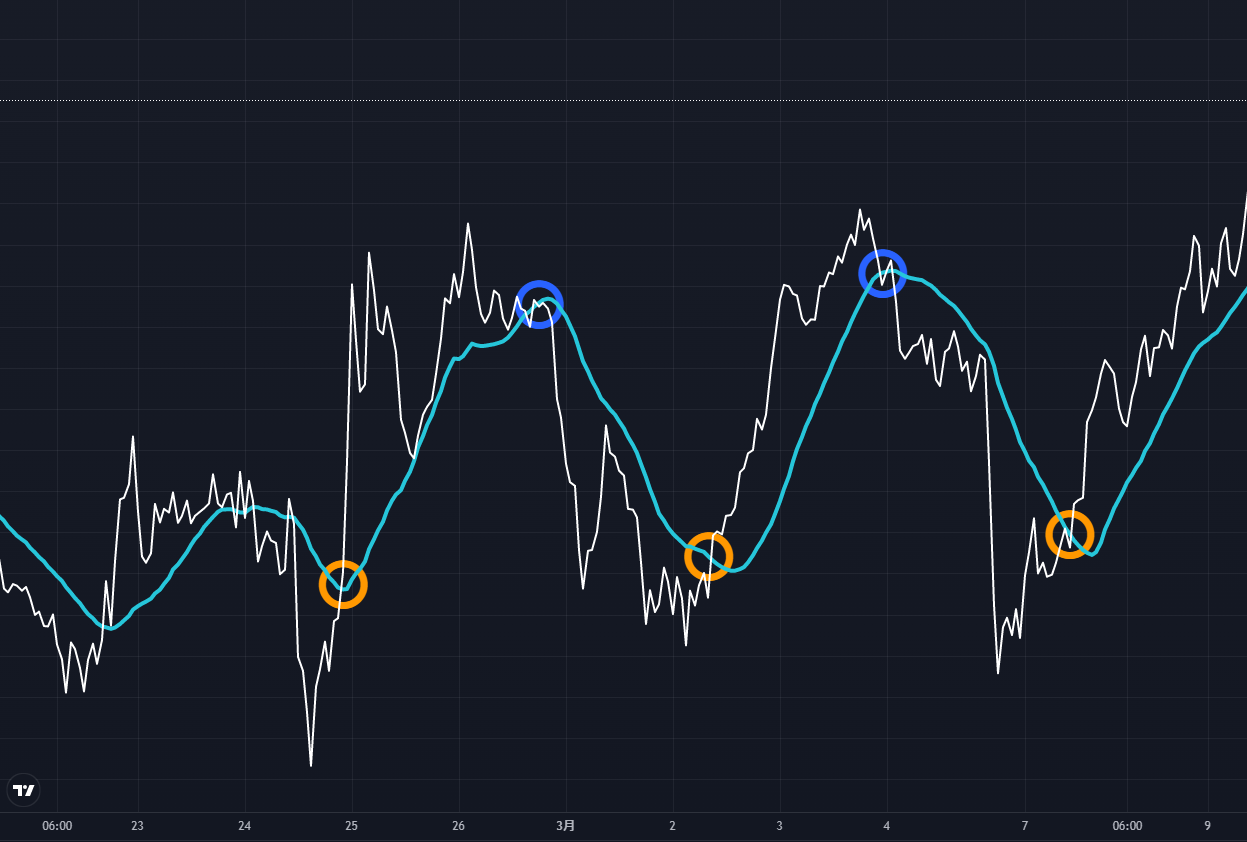簡単にいうと、傾きが変わったところが買い、もしくは売りのサインです。