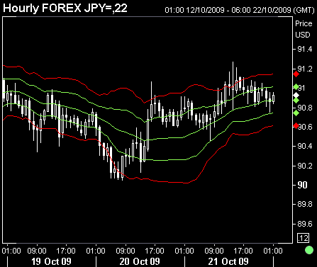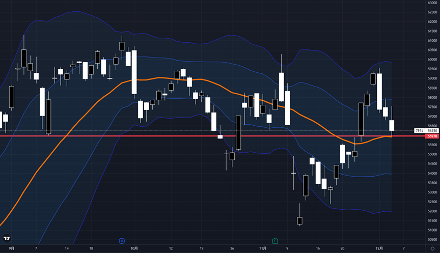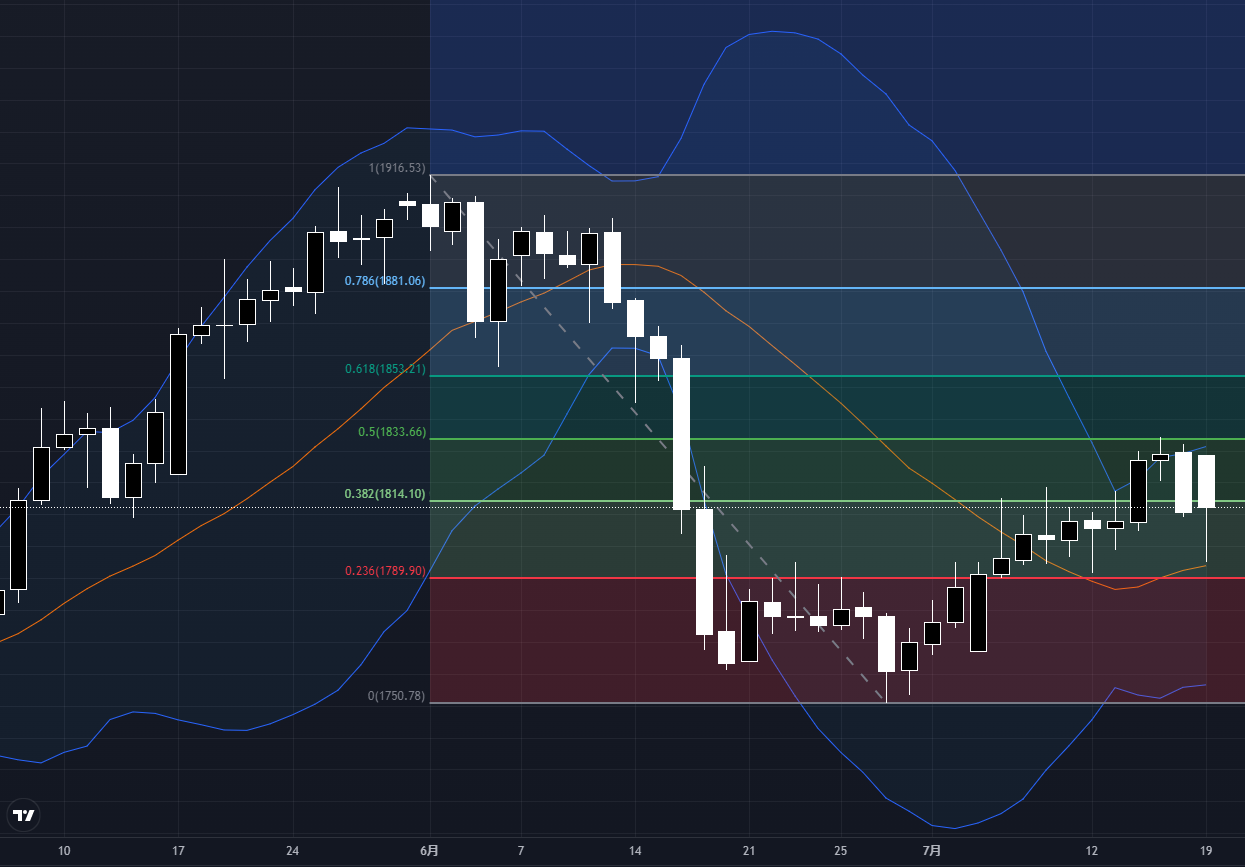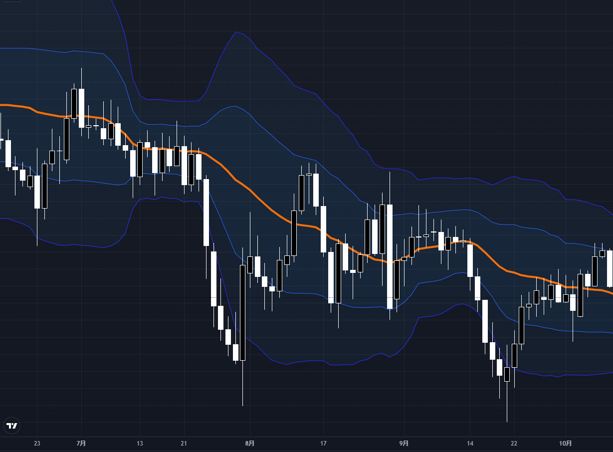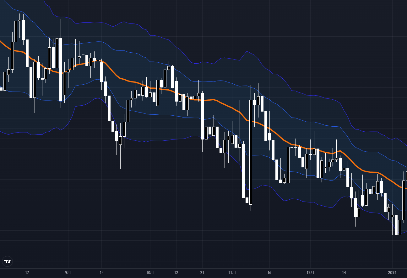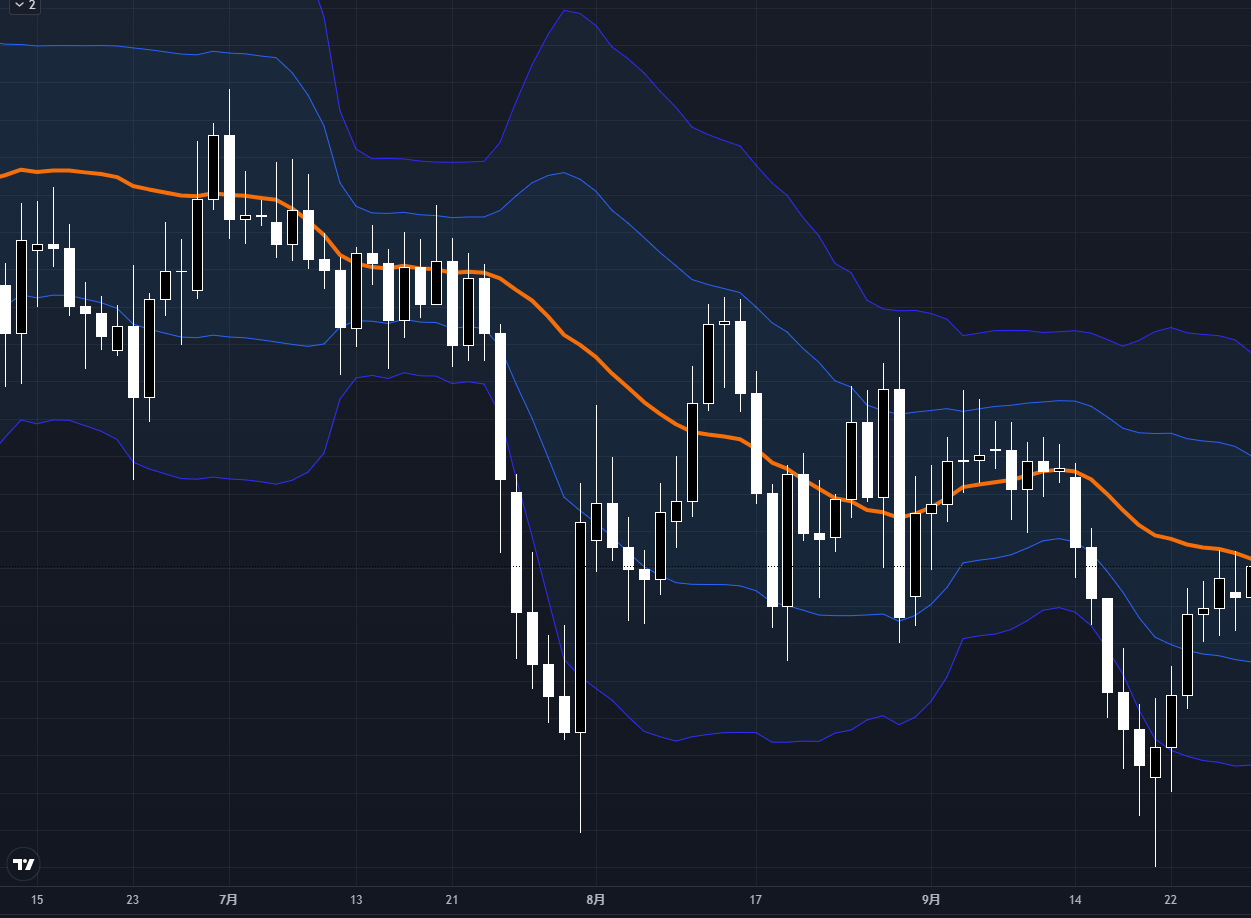 5日線(黄)は相場の動きに沿うように細かく上下していますが、一方、26日線(青)は相場の中心を縫うように推移しています。