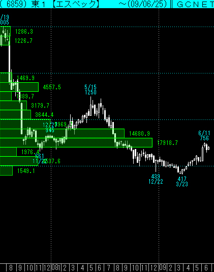 ※エスペック(週足)の価格帯別出来高分析 (チャート提供:GCハロートレンドマスター)