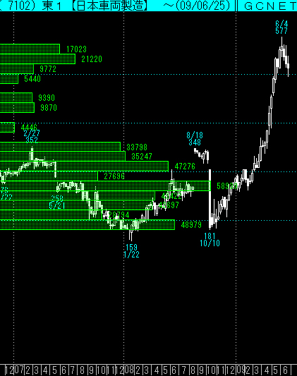 ※日本車両製造(週足)の価格帯別出来高分析 (チャート提供:GCハロートレンドマスター)