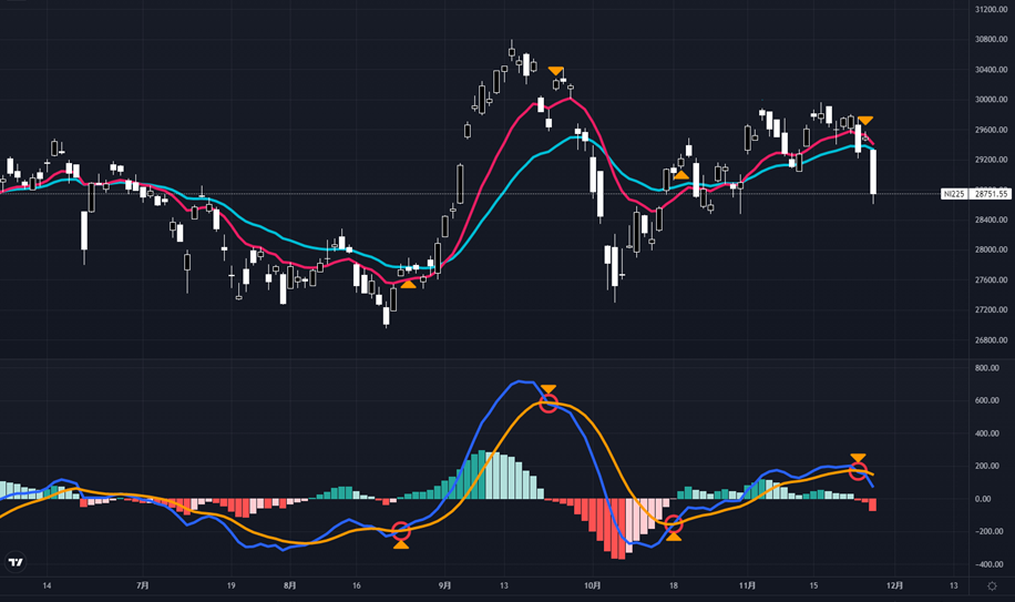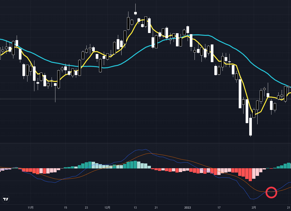 よく見ると、2つの指数平滑移動平均線がクロスするタイミングで