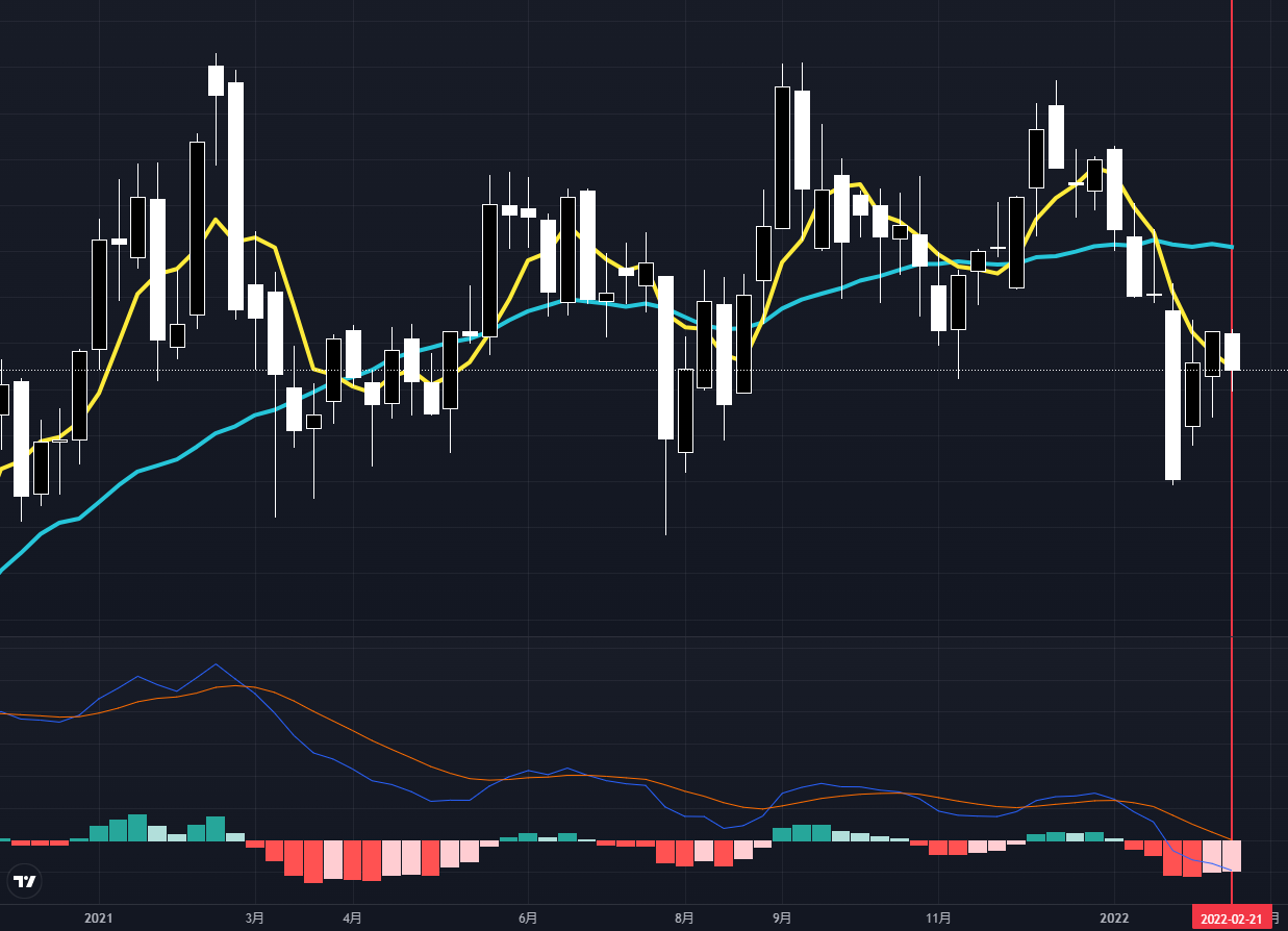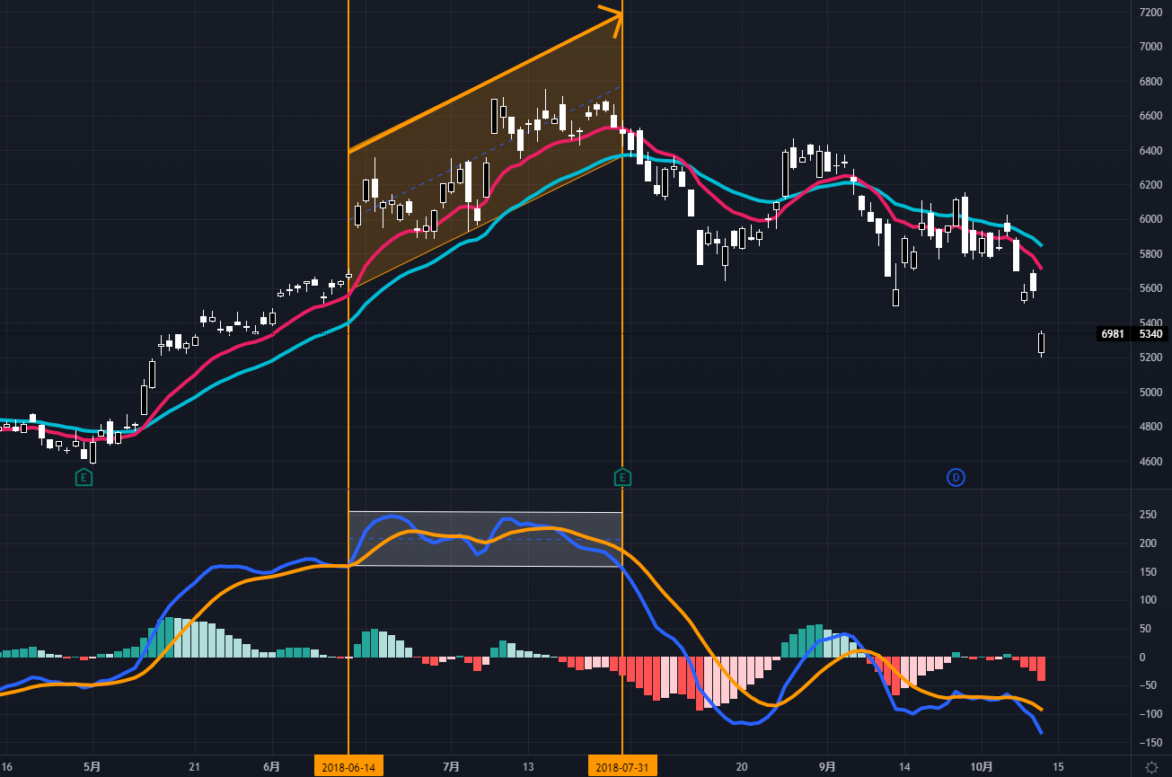 MACD(青)とシグナル線(オレンジ)をご覧ください。