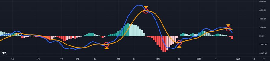2つの指数平滑移動平均の動きと、MACD(青線)の動きを照らし合わせながら