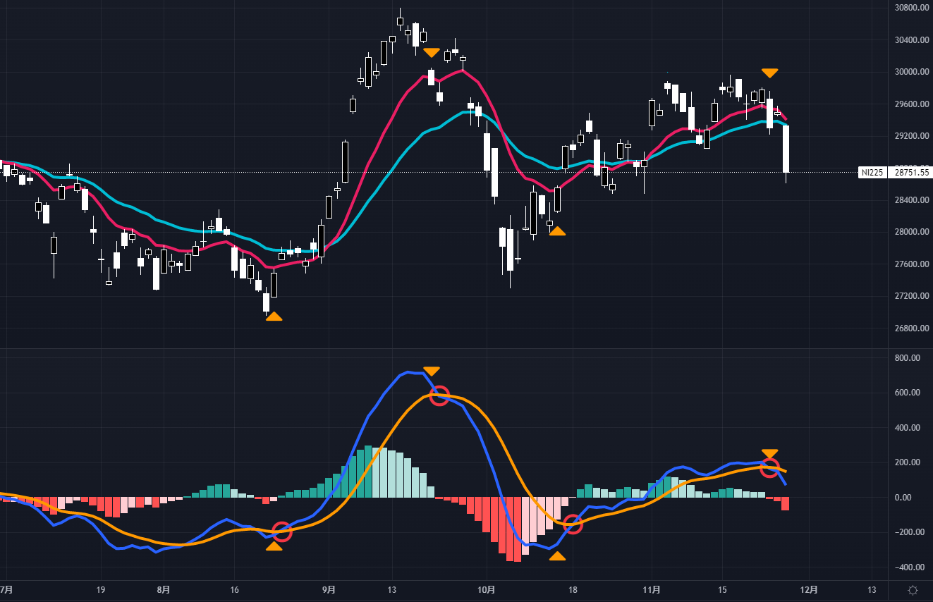 この手法は、MACDのパラメータ(参照期間)が短すぎなければ有効であるといわれています。