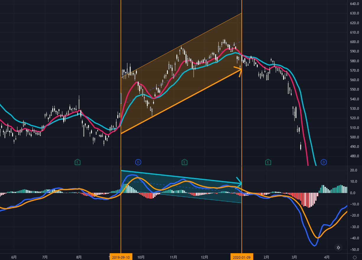 オレンジゾーンのところで株価は上がっているにも関わらず、MACDはほぼ横ばいで推移しています。