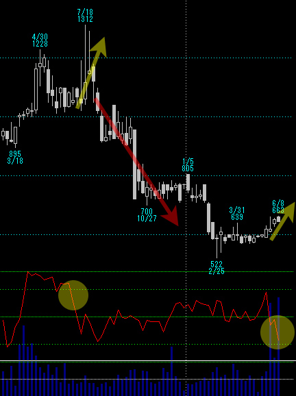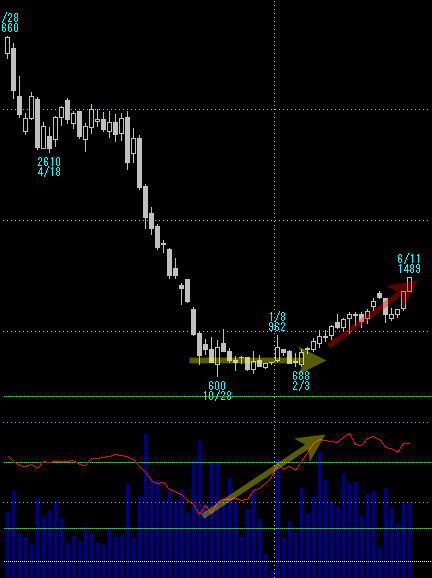 入ってくる、などということもあり得ます。出来高を伴わない上昇を危ぶむ理由です。