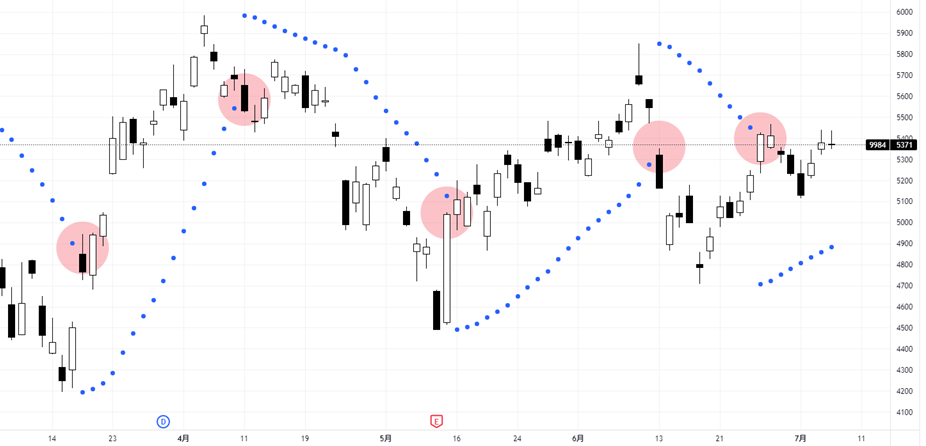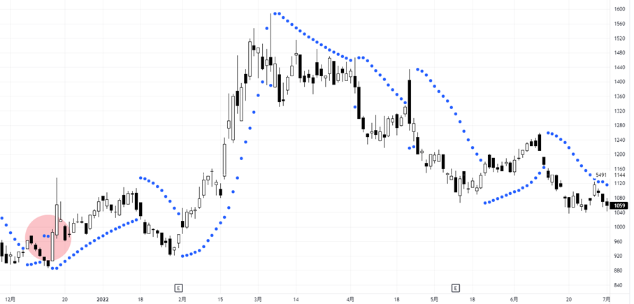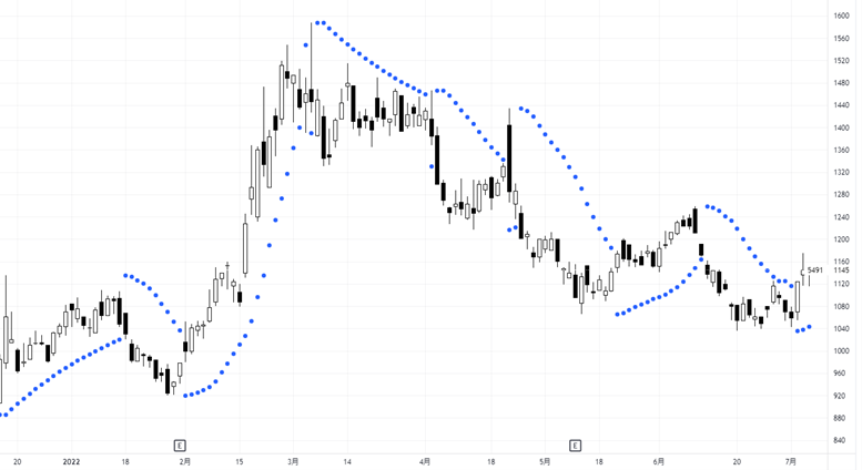 パラボリックがローソク足の下にある場合は上昇トレンド、