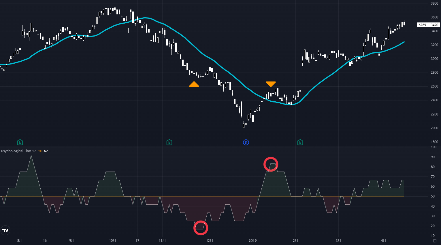 ではサイコロジカルラインを描画したチャートを見てみましょう。