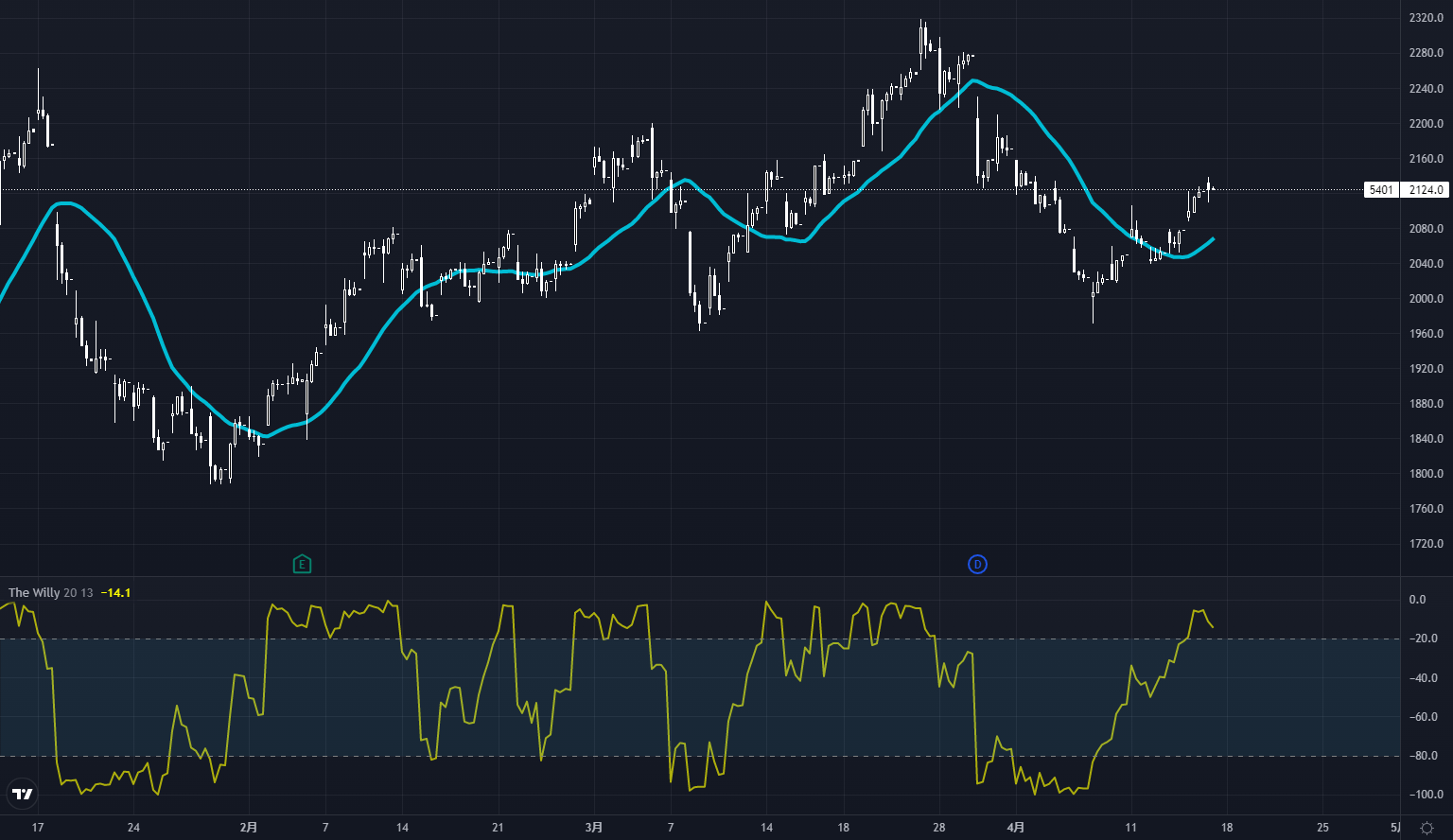 %Rオシレータは、20日間などある一定期間の最高値と最安値のレンジの中で、現在値がどの位置にあるのかを示した指標です。