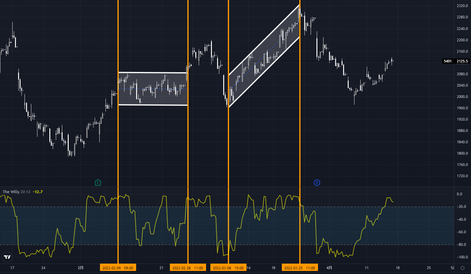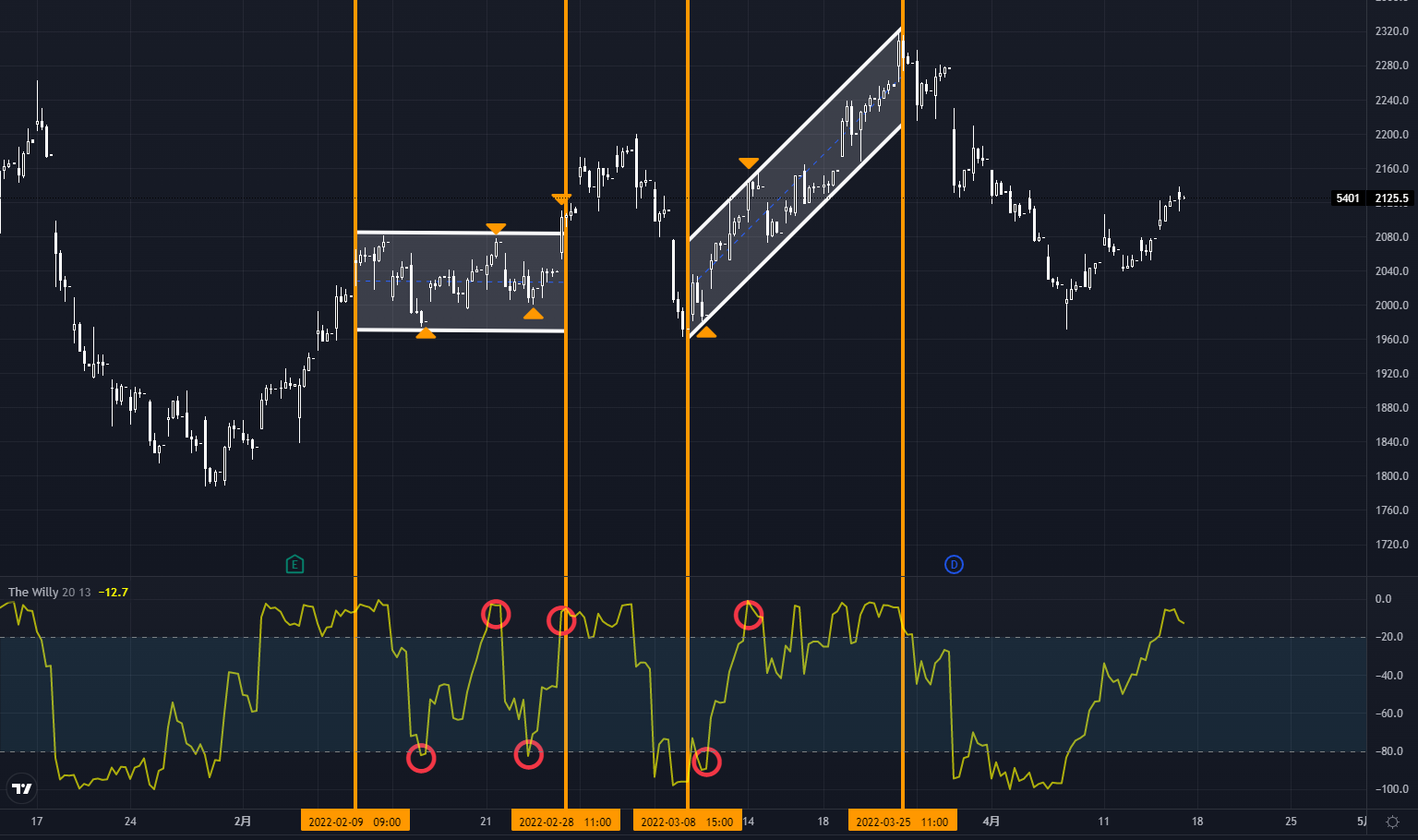 このことからも%Rオシレータがボックス相場に強みを持つことが理解できるかと思います。