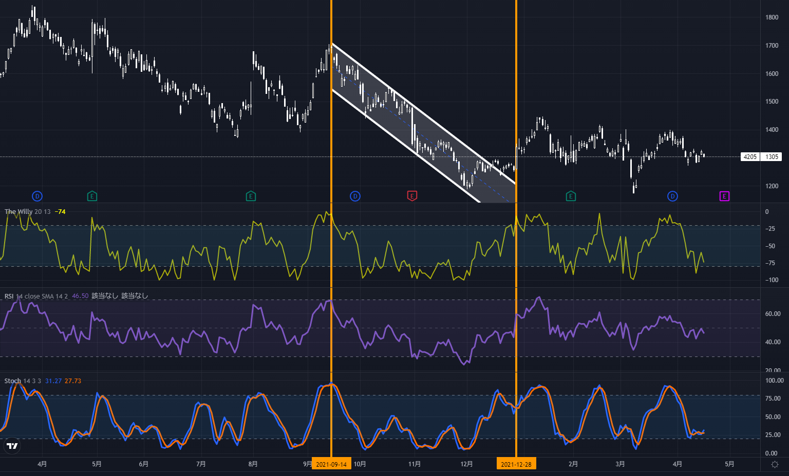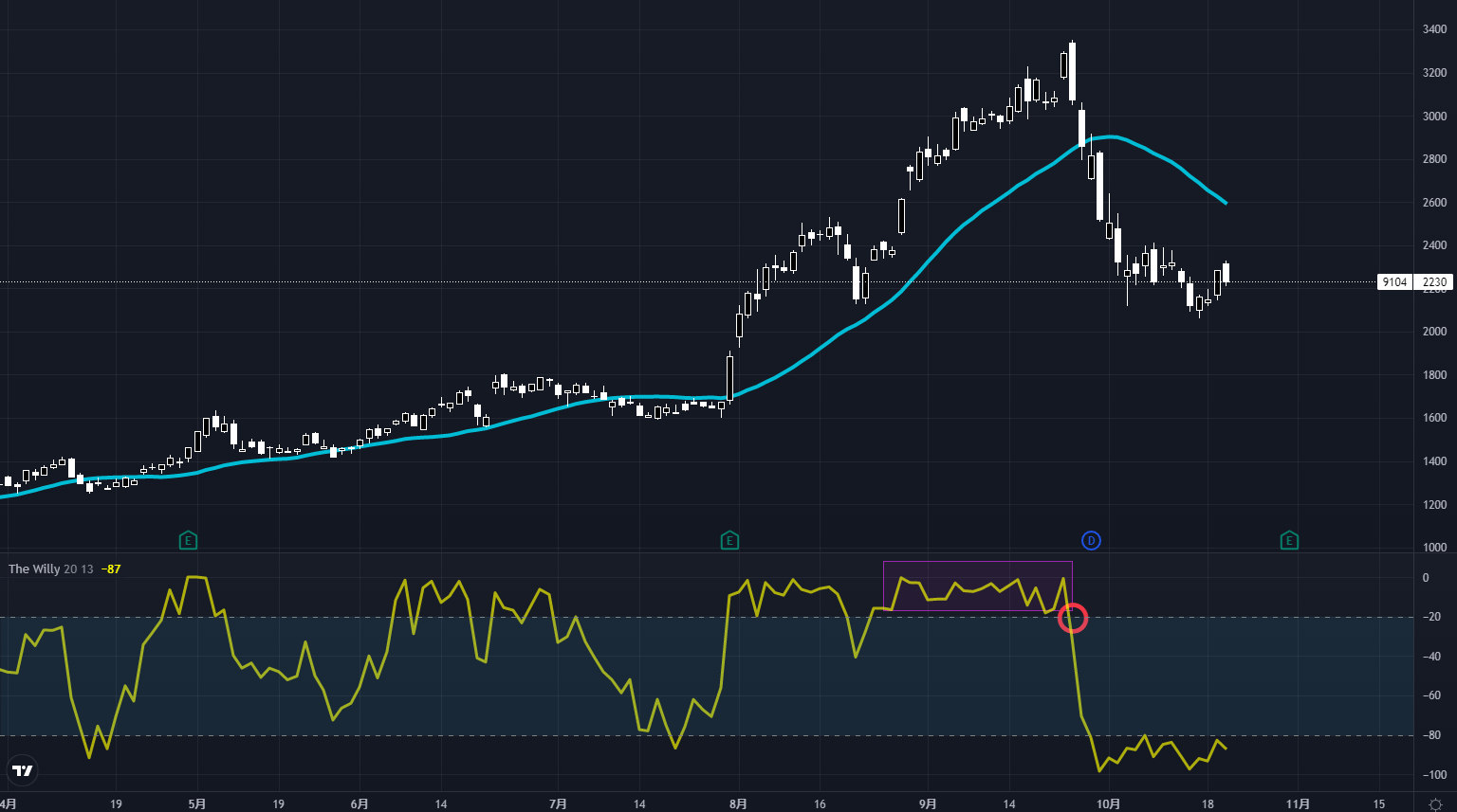 上昇の場面ではそもそも-20%以上に張り付いていることが多く、トレンドに乗ってきてからは買いのタイミングが一度も出てきておりません。