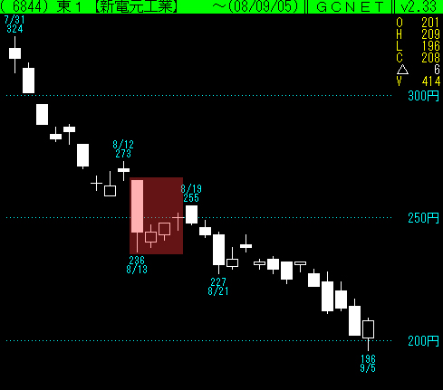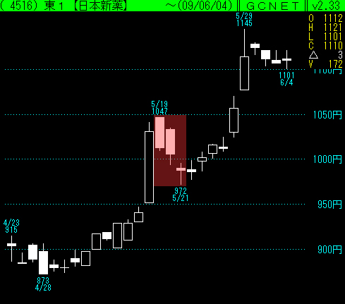 ローソク足のフォーメーションから、相場の流れを読み解く“酒田五法”の1つ、「三法」です。3本連続の陽線や陰線の出現をいいますが、 「三兵」とは異なる出現位置に注意を要します。比較的長い陽線や陰線の出現の後に、その足の長さに満たない範囲での3本連続の反対線(陽線のあとの3連続陰線、陰線のあとの3連続陽線)が出た場合をいいます。このような状況のときは、相場が小休止しているだけで、再びそれまでのトレンドに復活すると読みます。