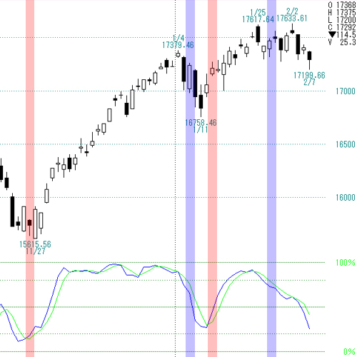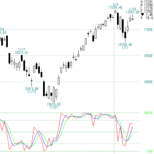 ▼日経平均のストキャスティクス (チャート:GCハロートレンドマスター/ゴールデンチャート社)