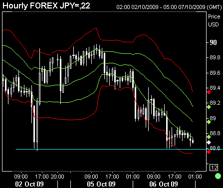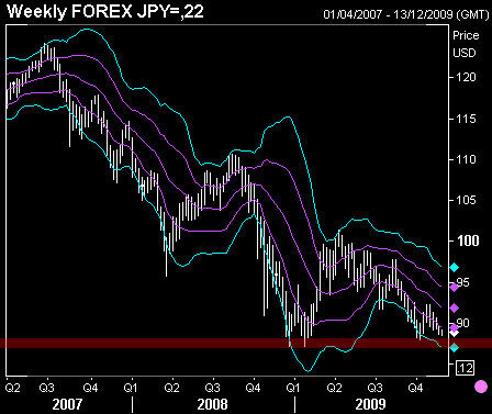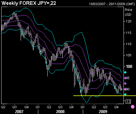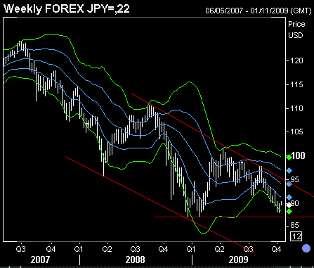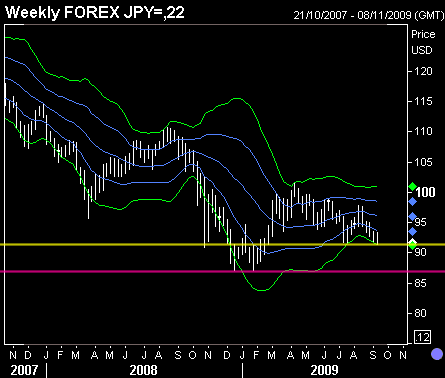 下のチャートはドル円の週足です。ボリンジャーバンドも描画していますが、それとは別に、黄線と赤線の2本のサポートラインを引いています。サポートラインは、過去に何度かその値段のブレイクにトライしながらもはね返されて反発していった箇所を銭で結んだものをいいます。黄線や赤線はまさにそうしたポイントを結んでいます。ドル円の現在値は黄線のブレイクを試しているところですし、それを超えて下落したとしても次にまた赤線のサポートが控えています。それすらも割り込むと新たな相場が作られていく、という見方をします。サポートライン近辺では、反発するかもしれないことを予想したポジションの作り方が必要になります。