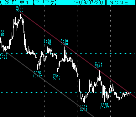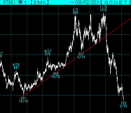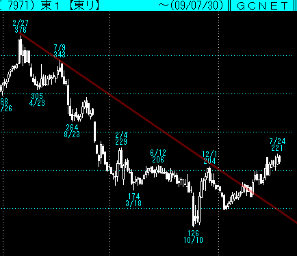 このチャート例に限らず、大きく長い上昇トレンドの下値支持線を割りこんできた場合、そこから雪崩のように下落するケースが多いように思います。