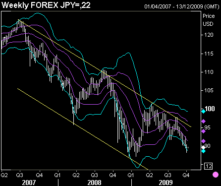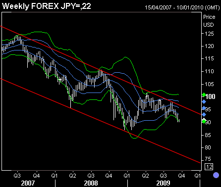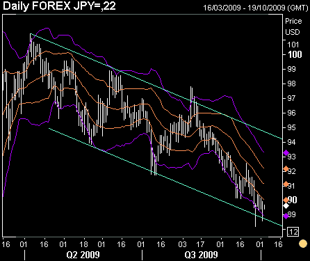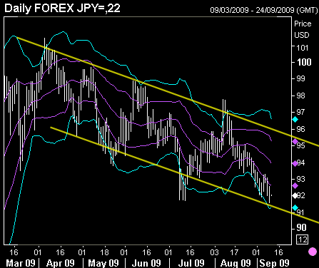 上昇トレンドを定義づけるものとして、下値支持線があります。相場の波動の下端を捉えたものです。下チャートは上昇トレンドの下値が、ある1つの直線によって支えられている様を示しています。