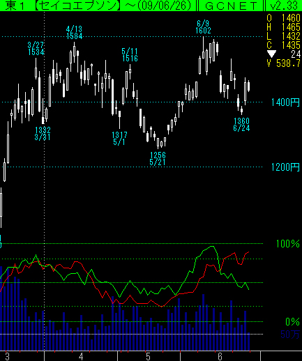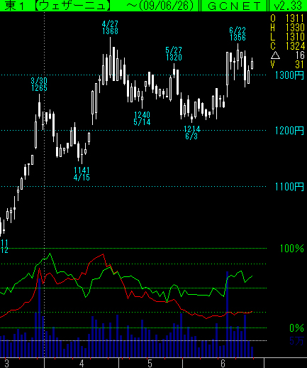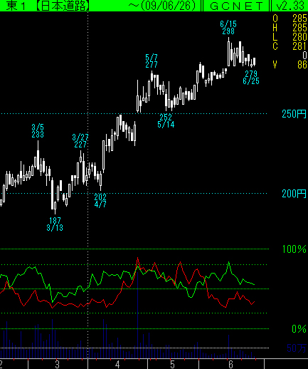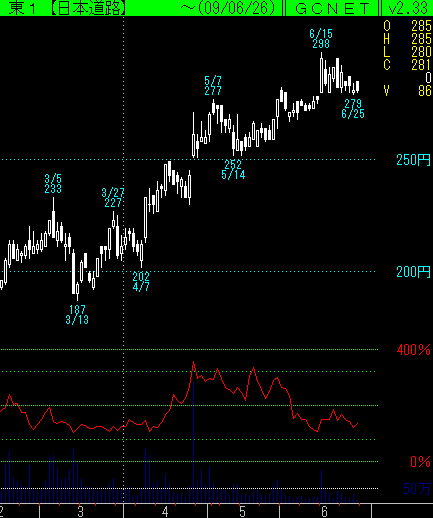 下のチャートは日本道路の日足チャートに、パラメータを25日間に設定したボリュームレシオ(赤線)を描画したものです。
